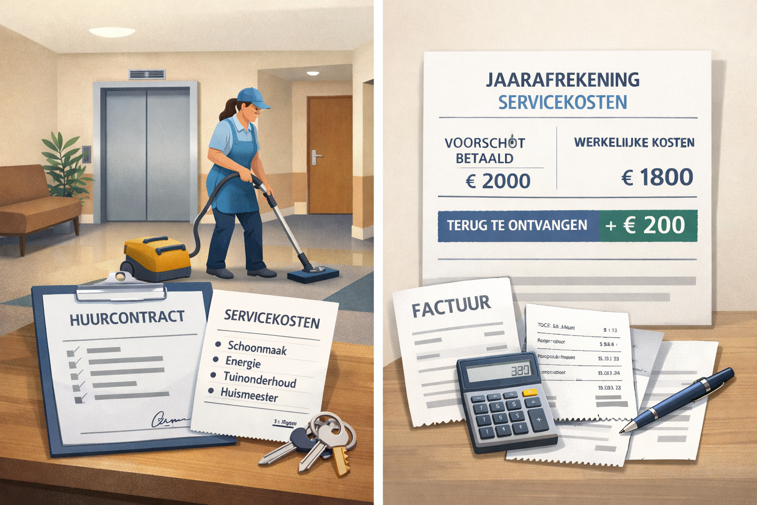 Servicekosten zijn kosten bovenop de kale huur voor diensten en leveringen die samenhangen met het gebruik van de woning of het gebouw. Het gaat bijvoorbeeld om schoonmaak van gemeenschappelijke ruimtes, energie en verlichting van algemene delen, tuinonderhoud, liftonderhoud of een huismeester. Deze kosten mogen alleen worden doorberekend als ze expliciet in het huurcontract zijn opgenomen en daadwerkelijk door de verhuurder zijn gemaakt.