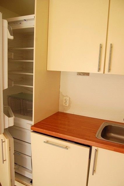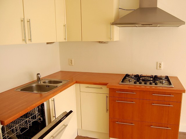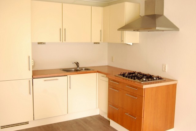 Moderne inbouwkeuken gelegen in de woonkamer en voorzien van de volgende inbouwapparatuur: koelkast/vrieskastcombinatie met drie diepvriesladen, vaatwasmachine, 4-pits gaskookplaat met rvs afzuigkap.