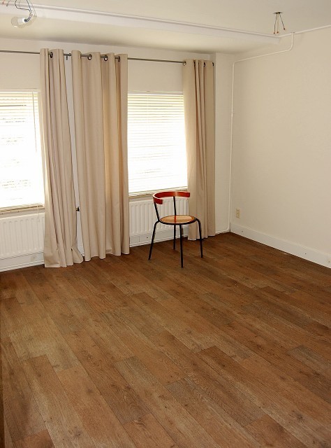 Gelegen op de eerste etage. Wanden voorzien van behang en het plafond is voorzien van gipsplaten. Voor de ramen hangen gordijnen.